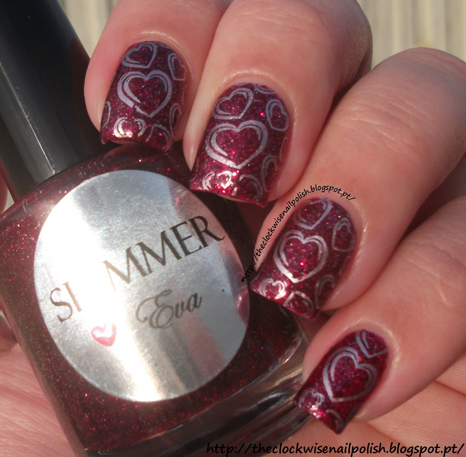 No segundo dia comecei a sentir o espírito do dia dos Namorados e o Shimmer Eva pareceu-me uma boa base para brincar com corações :) Escolhi-os da plaquinha BM 317 e carimbei com o verniz Essie Nothing Else Metals. Adooooro o resultado!!