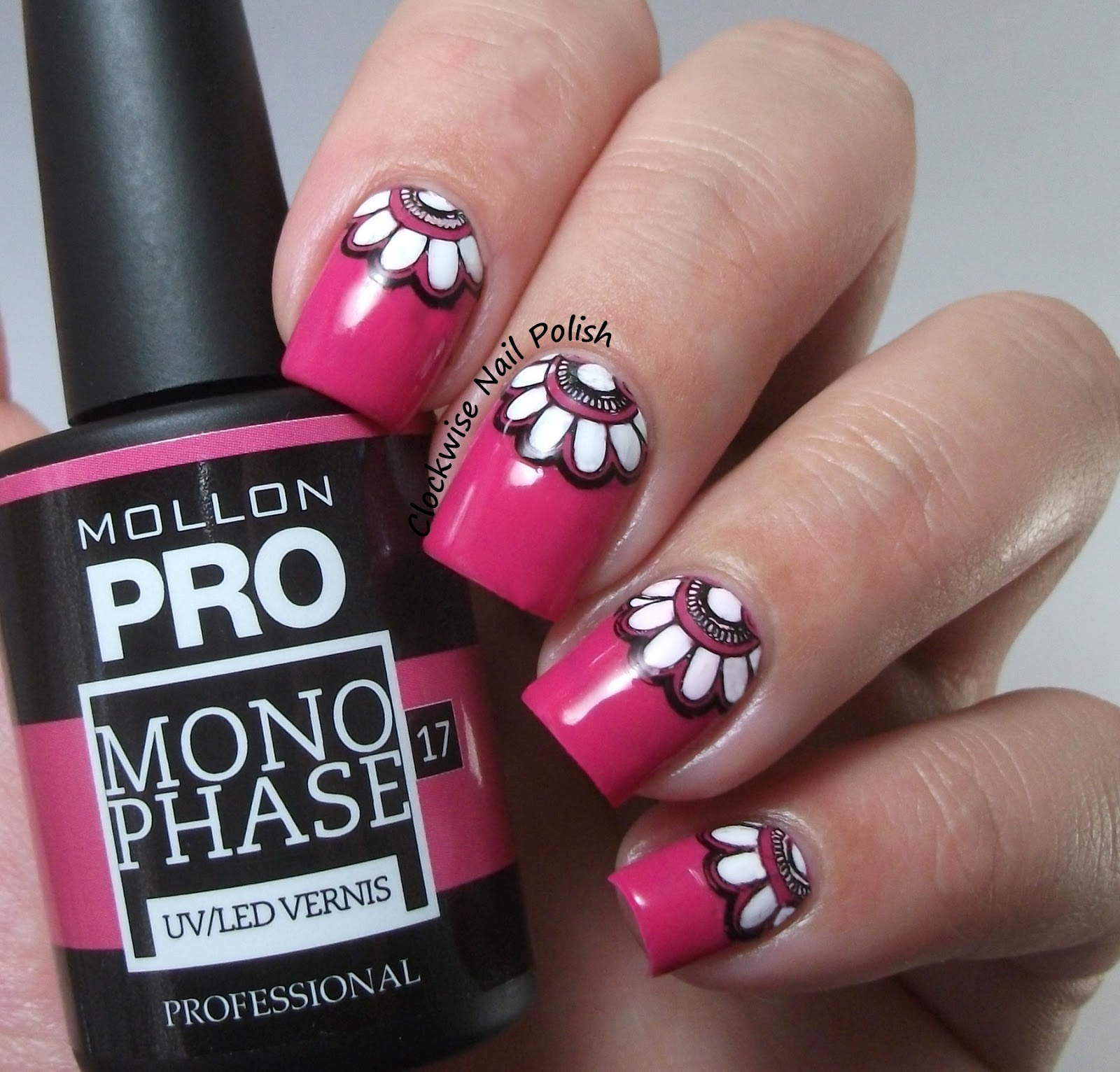 Relativamente à nail art, este belo rosa lembra-me flores... de modo que fiz um adesivo de carimbo a partir da placa Pueen Encore SE02B e posicionei junto das cutículas.