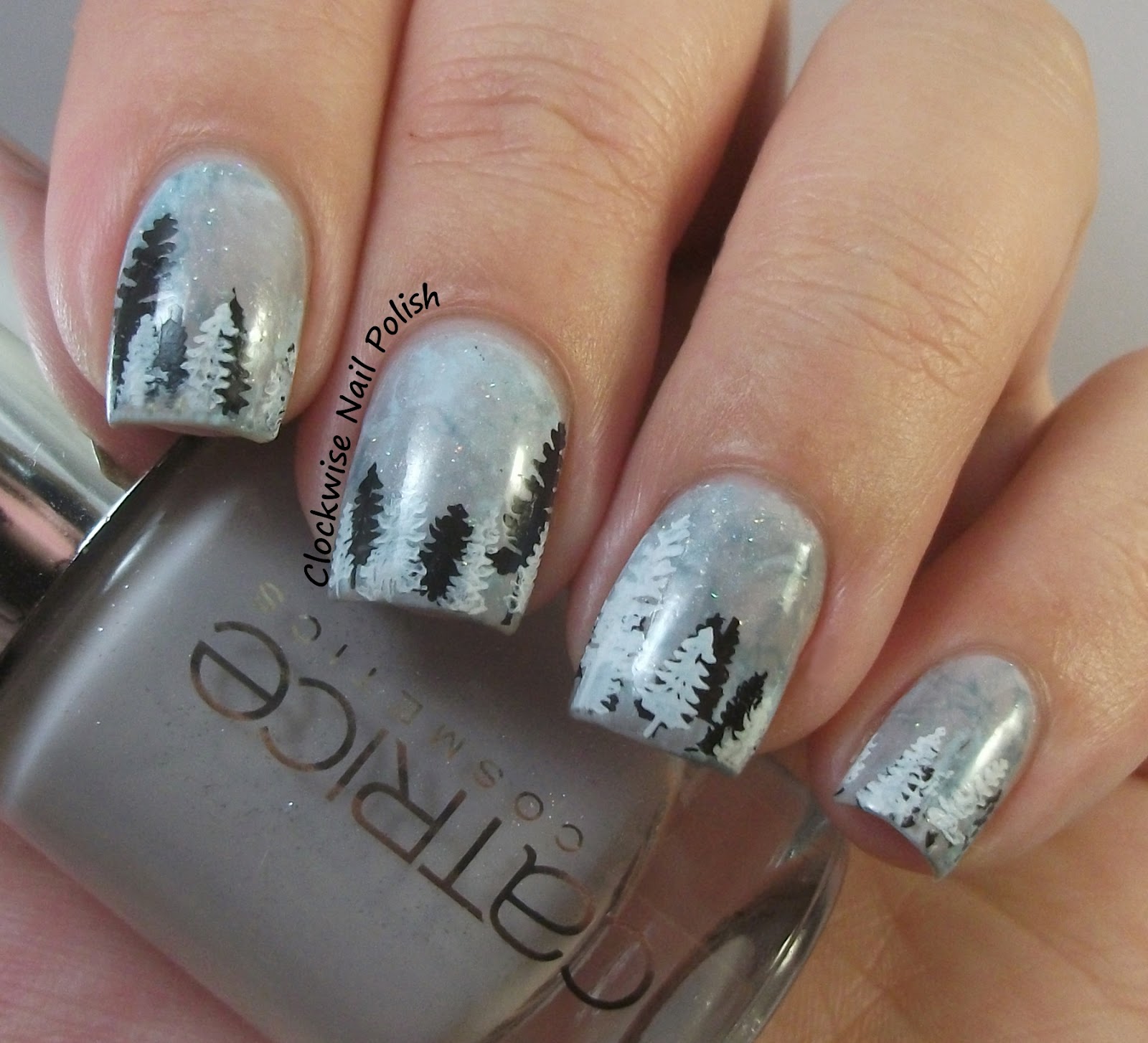 For the following nail art, I wanted to create sort of a snowy wintery landscape. For the landscape I picked the saran wrap nail art technique and used several polishes, including Catrice LOVEnder, ILNP Paper Route, Golden Rose WOW 75 and a grey polish. Ohhh I loved this base so much!! *-* Then I stamped the trees from DRK Seasons with black & white polishes from Mundo de Uñas.