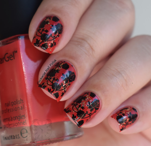 Speaking of senseless desire, my love for roses never ends... this time, I found it in B. Loves Plates B.02 Flower Power stamping plate. I stamped these roses with MoYou London Black Knight over a dust of gold glitter and Kinetics Senseless Desire.