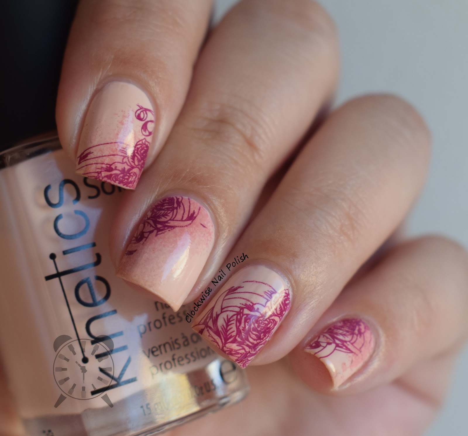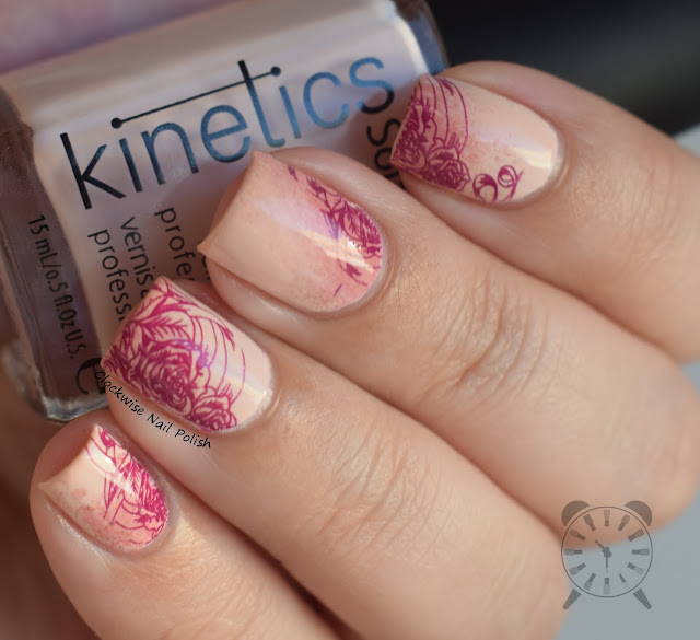 Speaking of Kinetics Why not my Friend, this is I believe my favorite shade of the collection! That's because it's a very soft pink nude that simply matches every single other polish of the collection - the perfect complement :) I did a rose nail art with it. My base was Kinetics Why not my Friend and Kinetics Spotlight Fail. I stamped the roses from Uber Chic UC 4-01 stamping plate with MoYou Rock Night stamping polish.