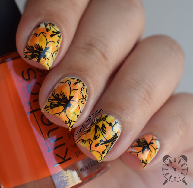With the above colors, I took the opportunity to Escape to a tropial island haha. I did a nail art ft those shades and tropial flowers. The flowers come from Creative Shop 41 stamping plate and were stamped with MoYou Black Night stamping polish.