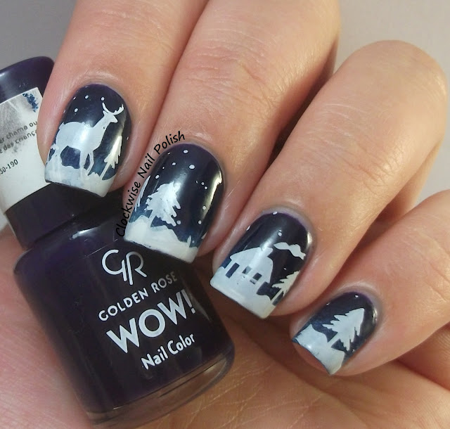 My first nail art is a Winter night landscape. I really, really love the snow covered house and trees *-* I wish I could go retire to a place like that haha! I started by doing a blurple gradient which unfortunately isn't very noticeable, but discreet and I like it :) Pictured is Golden Rose WOW 81. Afterwards I stamped the snowy house and cute reindeer with Esmaltes da Kelly Dolly stamping polish.