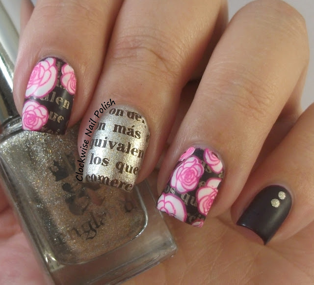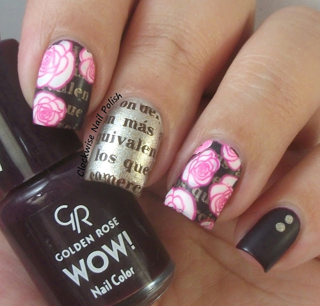 Last, but not least we have what I call a romantic letter :p I started this manicure with A England Excalibur and Golden Rose WOW 63 polishes. Then I stamped the words design from BP-76 plate. Yes, I'm aware it's not romantic words but something else haha! :p Finally I finished with roses which are stamping decals from BPL-024 plate. I used this manicure both matte and glossy, and I honestly loved both! :D