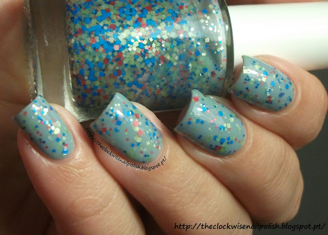 Não sei a que colecção pertence o verniz Kinetics Top of The Wave, mas sei que a marca encontra-se cerca de 100 vezes à frente da sua numeração (isto de acordo com os vernizes que tenho). Por outro lado, a tampinha do Top Of The Wave não tem o "K" gravado como os que tenho. Este verniz foi tão fácil de aplicar quanto todos os outros; a Kinetics tem uma excelente qualidade. A formula é algo fluida e por isso flui perfeitamente na unha. Precisou de duas camadas e secou rápido com um brilho quase gel, deslumbrante :) Só não tenho a certeza da cor... se é um tom verde água ou turquesa claro lol. Seja como for, lembra-me o Oceano e eu adoro-o! :)