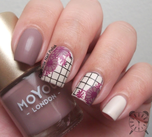 I had fun picking a nail art design and I'm still going a lot for the matte effect look. I stamped Andreia Pocket 19 with a leaf design from Moyra 104 stamping polish using Essie Nothing Else Metals.