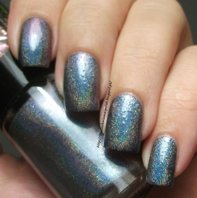 O efeito holográfico deste tipo de vernizes desaparece à sombra ou em ambientes com pouca luminosidade, sendo esta a característica que não aprecio em vernizes holográficos. Mas com o Ludurana Fenômeno e mesmo na sombra, houve sempre algo para deleitar os meus olhos lol uma vez que em fraca luz o efeito multichrome é muito evidente, brincando entre turquesa para azul, lavanda, verde, cinzento e penso que vi um tico de magenta também. :D Quão impressionante é este verniz?! Quero a colecção toda! lol. Para matar o meu coração, em ambientes fechados (onde estou a maior parte do dia) o verniz apresentava-se multichrome e holográfico ao mesmo tempo... fiquei apaixonada!