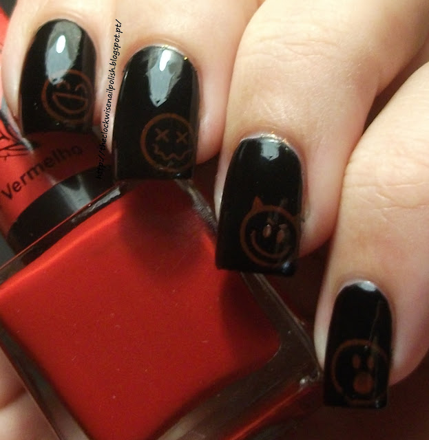 Depois, quando tive oportunidade de remover este verniz decidi experimentar fazer uma nail art com fita-cola. Cortei a fita-cola em triângulos e coloquei-a nas unhas segundo a foto abaixo. Depois apliquei uma camada do W7 Black e removi a fita-cola uma a uma. É uma nail art bastante simples :p. Terminei com uma camada do top coat Extra Brilho Ideal (e o glitter da Color Club finalmente ficou coma textura suave!) e usei esta manicure atá a manhã seguinte porque gostei do resultado :p